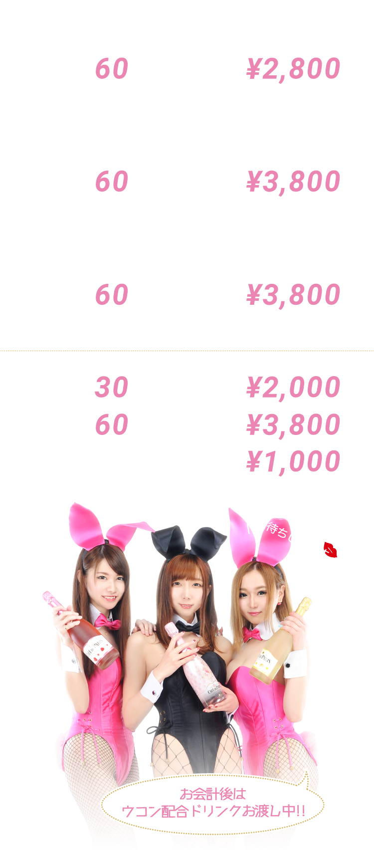JR神田駅から徒歩1分、晴花ビル2階です。 新人のバニーガールも多数入店。落ち着いた雰囲気の中で、女のコと楽しいひと時が過ごせるカナンは60分2800円で飲み放題!